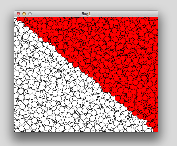 Write a sketch that repeatedly draws circles at random locations in the output window. Each circle should be filled either white or red so that the after many circles are drawn your output looks similar to this picture. That is, all circles below the main diagonal should be white and all circles above the diagonal should be red. You should see the circles appearing one at a time as the picture is drawn.