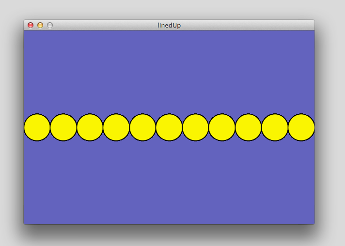 Draw 11 circles on the screen so that they are lined up horizontally and they occupy the entire width of the screen. Don't let the circles overlap and make sure all circles fit on the screen. Your output should look something like this picture.